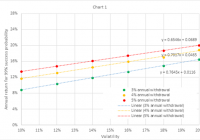 Summary A method is presented for evaluating risk of investment portfolios in retirement. This analysis defines risk as the chance of going broke during retirement, rather than a portfolio’s volatility. For adaptive asset allocation portfolios studied here, increasing volatility leads to decreasing risk. Introduction Investors benefit from availability of low-cost exchange-traded and mutual funds, and from myriad choices of strategies and tactics for allocating assets to a portfolio of these funds. Investors also have access to web-based tools to back test portfolio return and volatility. Then they can use those results as inputs to other web-based tools, to estimate worst-case and median future performance, taking into account planned contributions to the portfolio (for workers) or withdrawals (for retirees). What seems missing, however, is a systematic method to combine these tools to gauge the suitability of a portfolio for an investor’s own circumstances, and to reach a buying decision. For example, consider a recently-retired investor who needs to withdraw 3% of his or her savings per year, evaluating a choice between two portfolios: one with back test results showing 10% volatility and 9% annual return, and the other showing 18% volatility and 15% annual return. This analysis illustrates a method for making such a choice. The method has limitations, because back tests can turn out to be poor predictors of out-of-sample (future) performance, and because investors can feel uncomfortable using past performance as the only input to a decision — excluding other sources such as expert opinions on macroeconomic or political situations. However, the proposed method has the merit of providing an unemotional way to make an asset-allocation decision, based on easily-available data and tools. Consider a retired person who: Invests an initial amount at the start of retirement, Withdraws a percentage of the initial amount each year, adjusted for inflation, and Follows an asset class allocation strategy for the duration of retirement. Some advisors define a portfolio’s risk as its volatility, where volatility is an estimate of the standard deviation of annual returns. This is not helpful for choosing between portfolios when one has higher volatility and higher return than the other. A retiree could define risk less abstractly, as the chance of running out of money during retirement. A prudent retiree would first seek to reduce that risk to a negligible level, to avoid the catastrophe of going broke. That ensured, the retiree would next seek to increase the balance at the end of retirement, to leave a legacy. Simulation method This analysis used a Monte Carlo simulation tool at portfoliovisualizer.com , with input parameters set as shown in the table below. For each combination of annual withdrawal and volatility shown in the table, the analysis tried various values of expected return, until the simulation output showed a 99% probability of success. This means that at the preset annual withdrawal and volatility settings, 99% of Monte Carlo trials showed a positive balance at the end of retirement. In other words, the retiree did not go broke. The expected return setting that yields 99% probability of success represents the average annual rate of return necessary throughout retirement, to reduce risk to a negligible level at the given settings for annual withdrawal and volatility. Defining negligible risk as 99% probability of success (1% risk) seems appropriate considering the severity of the consequences of running out of money. The simulation tool also provides a median end balance, which gives the retiree’s legacy at the end of retirement in 50% of Monte Carlo trials at the given withdrawal rate and volatility settings, and at the expected return necessary for 99% probability of success at those settings. The simulator shows median end balance discounted for inflation, and therefore expressed in the same dollars as the initial invested amount at the start of retirement. Initial amount $1,000,000 (in today’s dollars) Annual adjustment Withdraw fixed amount annually Annual withdrawal $30,000, $40,000, or $50,000 for 3%, 4% or 5% annual withdrawal rate Inflation adjusted Yes Simulation period (years) 30 Simulation model Parameterized Returns Distribution Fat-Tailed Distribution (Student’s t-distribution with 30 degrees of freedom) Expected return Varied for combination of annual withdrawal setting above and volatility setting below, to obtain 99% “Probability of success” (1% risk of zero balance at end of retirement) Volatility Repeated at 10%, 12%, 14%, 16%, 18%, or 20% Inflation model Historical inflation (4.18% mean and 3.14% standard deviation, based on CPI-U from 1972 to 2014) This procedure yielded (volatility, return) pairs at 1% risk of going broke, for withdrawing an inflation-adjusted fixed amount annually, equal to 3%, 4%, or 5% of the initial amount. It also provided the median end balance at this volatility, return, and withdrawal rate. Simulation results The simulation tool provided the results in the table below, where “Median annual return” = (Median end balance / Initial amount)^(1/30)-1, This equation gives the median annual rate of return during retirement after inflation and withdrawals, at the selected withdrawal rate (3%, 4%, or 5%), the selected volatility, and the rate of return required to reduce risk to 1%. Annual return for 99% success probability Median annual return after withdrawals Volatility 3% rate 4% rate 5% rate 3% rate 4% rate 5% rate 10% 9% 12% 13% 6% 8% 10% 12% 10% 13% 15% 7% 10% 11% 14% 12% 15% 16% 9% 12% 13% 16% 13% 16% 17% 11% 13% 14% 18% 15% 17% 19% 12% 14% 15% 20% 16% 19% 20% 13% 16% 17% Chart 1 below shows that annual return required for 99% success probability increases linearly with volatility over the volatility domain studied. A portfolio with volatility and annual return on or above the investor’s withdrawal percentage line h